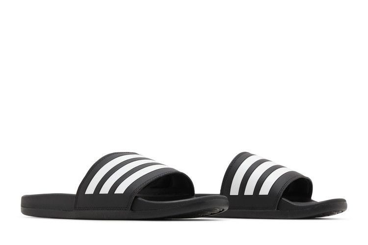 The black and white adidas Adilette Comfort Slide is a versatile two-tone sandal designed to give tired feet a break. Wear them barefoot or with socks, and they offer a comfortable fit thanks to the cushioned Cloudfoam footbed and one-piece faux leather strap. The latter features white 3-Stripe branding and an open toe for ventilation. EVA midsole provides lightweight cushioning.