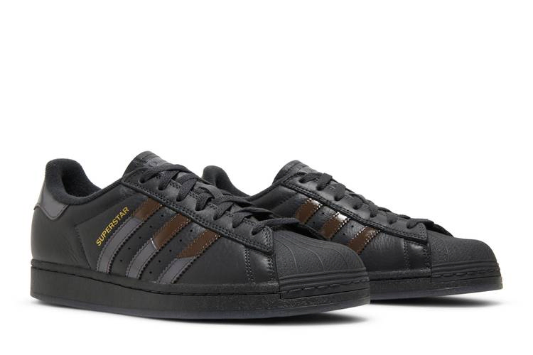 Created as part of a collaborative capsule collection, the Dime x adidas Superstar ADV 'Carbon Brown' updates a classic silhouette with a stealthy look. The upper features a Black full-grain leather upper with the iconic Black rubber toe cap. In addition to the signature Three Stripes, two-tone patent leather is used on each heel tab, along with mismatched adidas and Dime branding. The black rubber outsole sits atop a translucent herringbone traction outsole, which features a large Dime logo framed in gold metallic.