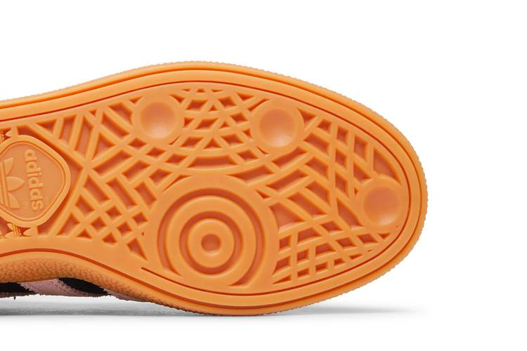 The adidas Spezial Women's Handball Shoe 'Black Clear Pink Gum' features a contrasting two-tone colorway of a retro model originally released in 1979 for indoor court play. The Black suede upper is accented with Pink suede detailing on the signature Three Stripes and rear tongue. The pastel shade is repeated on the adidas laces, liner and tongue. "SPEZIAL" is printed on the side panel in gold foil. Rubber outsole maintains a low silhouette.