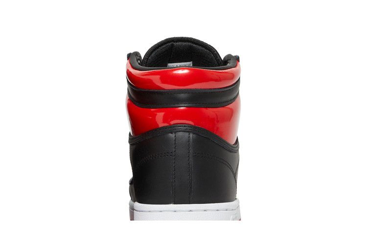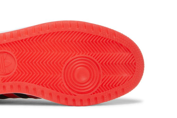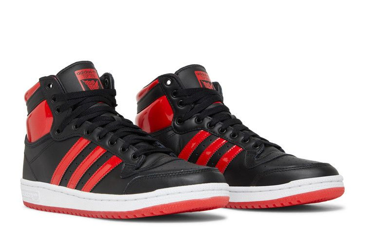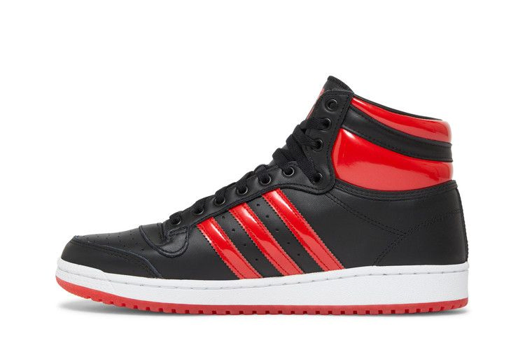 The adidas Top Ten High "Black Vivid Red" features brilliant color accents on a silhouette that debuted in 1979 as a hockey shoe. The sneaker features a sleek black leather contrast with crimson patent leather on the high collar and signature 3 Stripes. The sneaker features a white rubber outsole with adidas branding embossed on the lateral side. Outsole made of red translucent rubber with a time-tested herringbone pattern.