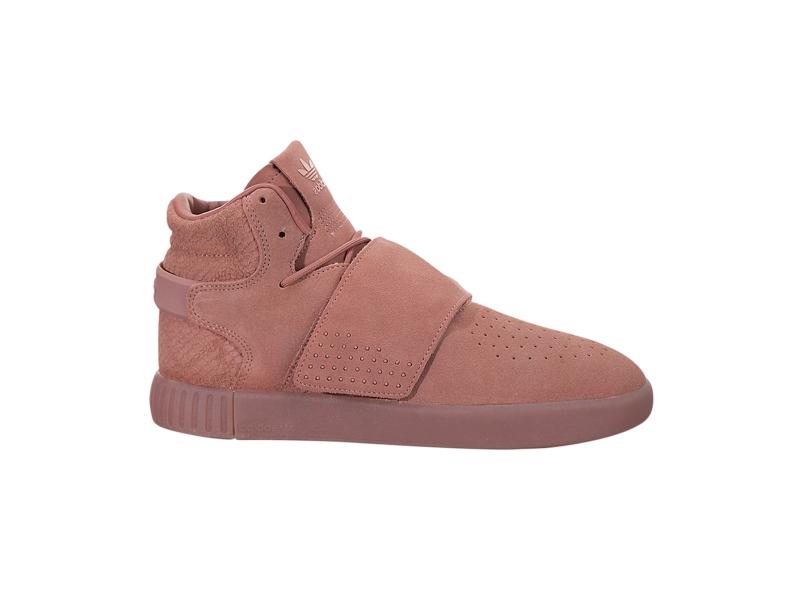 The adidas Tubular Invader Strap takes the prototype running shoe of the '90s and redesigns it to make it fresher. Subtle details add a premium look to the brown and pink suede upper. Perforations on the heel enhance ventilation and echo the miniature bolts on the large midfoot strap. A snakeskin pattern on the heel contrasts with the suede. High top provides support.