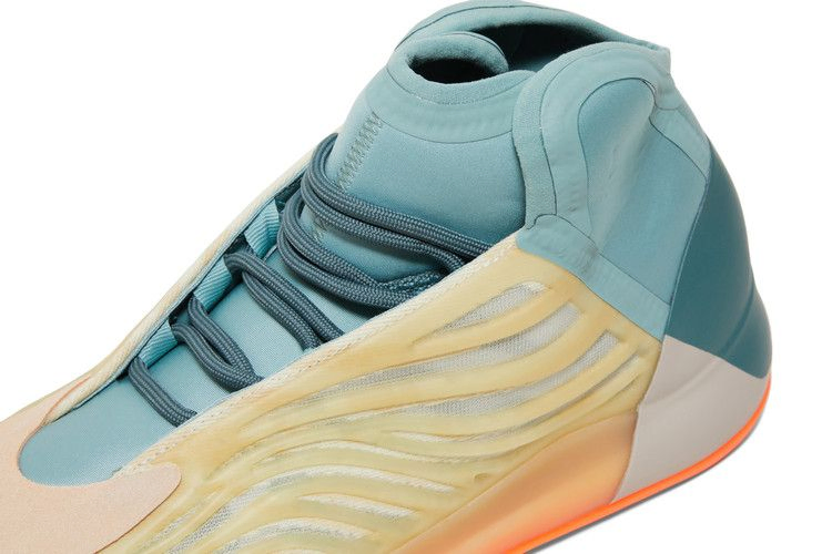 The adidas Yeezy Quantum "Hi-Res Coral" brings the basketball-inspired silhouette to life with an energetic color palette. The sneaker's unique design features the flowing lines of yellow RPU plaid overlaid on a translucent jacquard mesh upper. The toe box is reinforced with beige synthetic suede, while the collar and heel are made of stretchy neoprene in a subtle sage green hue. The sneaker sits atop a full-length Boost midsole with an orange TPU frame and color-matched rubber outsole.