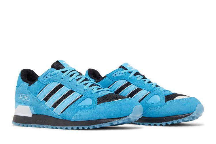 The adidas ZX 750 "Black Sky Rush" features vintage 80s sneakers in a vibrant colorway. The upper features breathable black mesh and soft suede overlays in a vibrant blue hue. Color-coordinated 3-Stripes adorn the shoe's quarter quarters, while ZX 750 branding is featured on the lateral heel. A durable black EVA midsole provides lightweight cushioning with every step. Outsole made of translucent blue rubber with a wavy pattern for optimal traction.