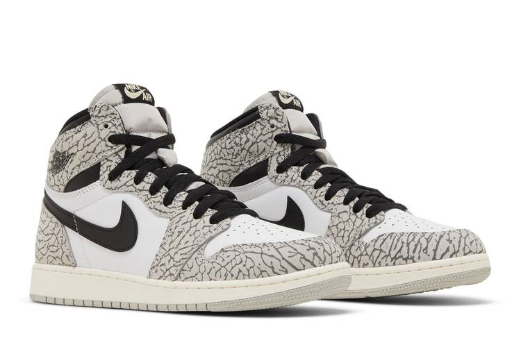 Created for the big kids, the Air Jordan 1 Retro High OG GS 'White Cement' features the signature print created by Tinker Hatfield and introduced to the world on the Air Jordan 3. Michael Jordan's signature sneaker debut features a white leather The upper features Gray elephant print overlays and a Black leather Swoosh. The breathable nylon tongue features a woven Nike Air label, while a retro Wings logo is debossed on the lateral ankle. The midsole is made in white, which emphasizes the vintage aesthetics of the sneakers.