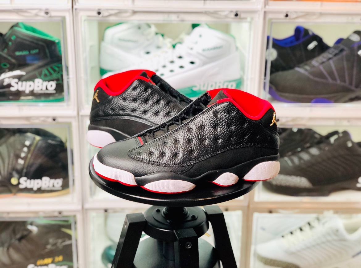 Inspired by the Black Panther, the Air Jordan 13 OG, released in 1997, features signature elements such as a green holographic sphere representing the animal's eye and a panther-inspired outsole. Organic shapes are complemented by classic Jordan colors of black, red and white. They feature black leather and durabuk overlays with patterned indentations, a white midsole and a thin True Red outsole.