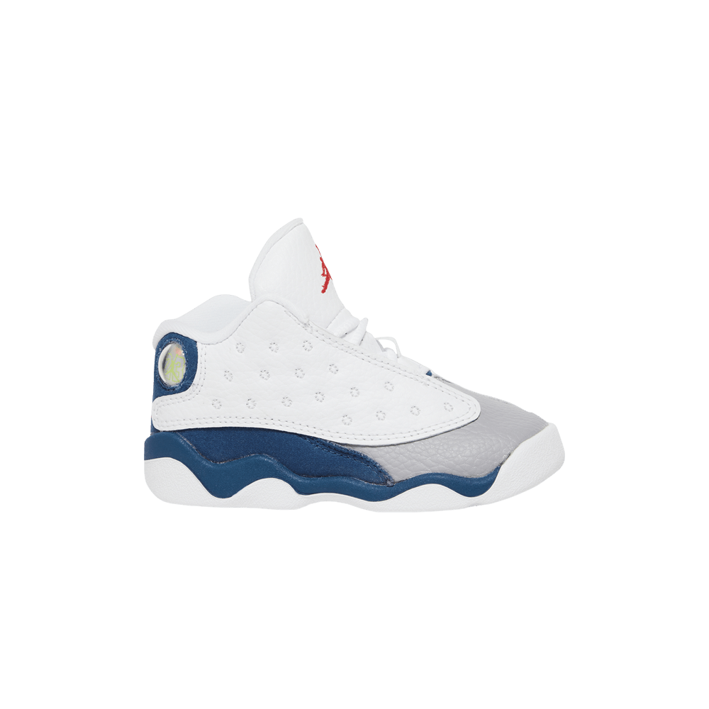The Air Jordan 13 Retro TD "White French Blue" is a scaled-down version of the silhouette for a new generation of Michael Jordan fans. The upper combines a Gray leather toe box with Blue suede panels and a pair of White dimpled leather overlays on either side. A red Jumpman is embroidered on the tongue, while the side collar features the 13's signature holographic eye. The rubber outsole features herringbone traction elements for superior traction.