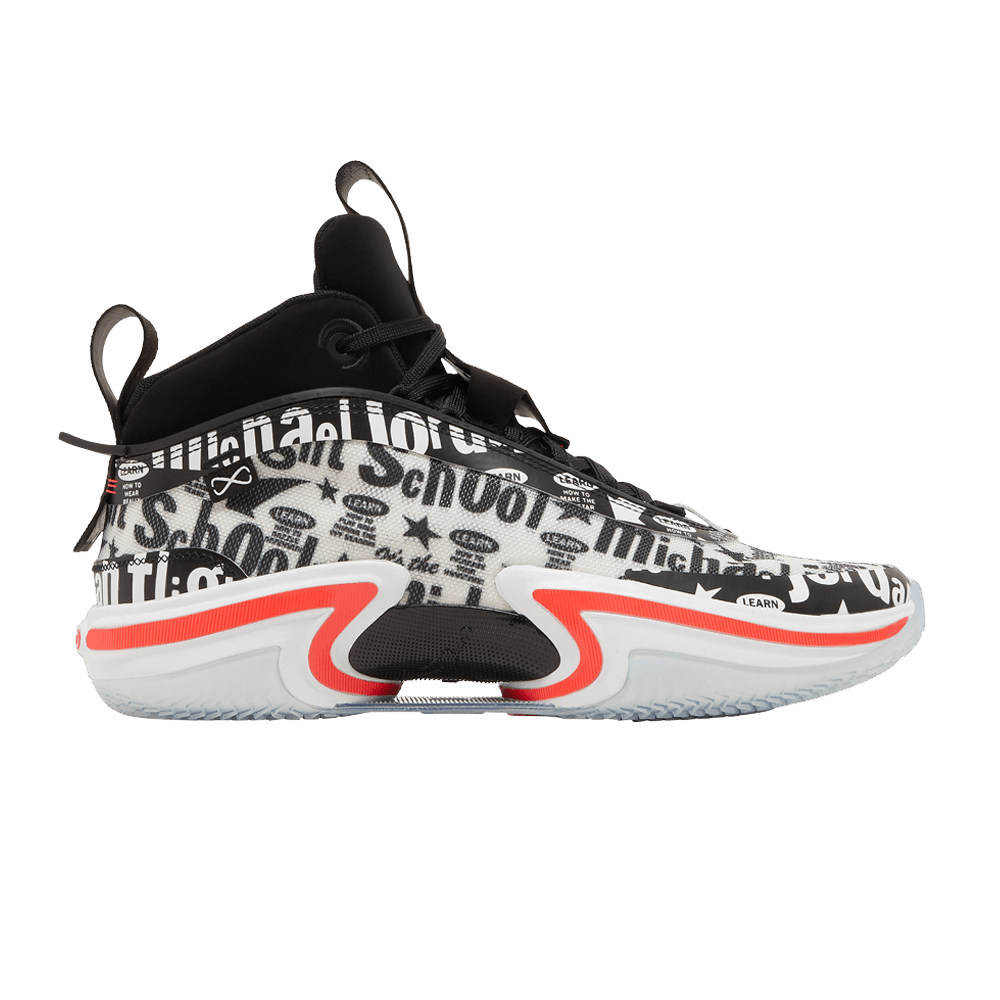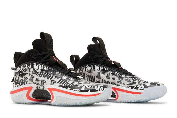 The Air Jordan 36 'Flight School' features a unique design rooted in Jordan history. The Leno-Weave's white upper is dominated by bold text graphics inspired by the vintage 1991 ad campaign starring Mars Blackmon, MJ and the Air Jordan 6. Contrasting bright crimson accents are found on the sneaker's branding and padded Phylon midsole. a full-length Zoom Air Strobel outsole and forefoot Zoom Air sockliner. Translucent rubber outsole provides traction.