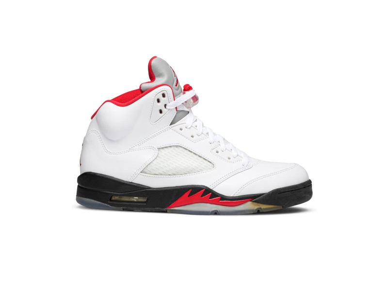 For the 30th Anniversary, the 2022 Air Jordan 5 Retro 'Fire Red' returns in a colorway of the classic OG silhouette. The design remains true to the original with a White leather upper with Silver reflective tongue and Nike Air branding on the heel. A black midsole adorned with red shark teeth detailing, inspired by the World War II P-51 Mustang fighter plane, is enhanced by an icy translucent outsole.