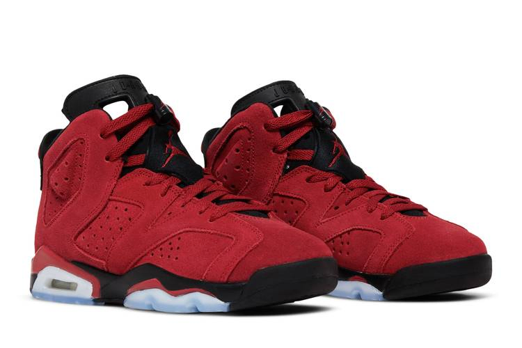 Looking after the Air Jordan 5 of the same name, the Air Jordan 6 Retro GS "Toro Bravo" features a sleek suede silhouette in an eye-catching scarlet hue. Heritage details include perforations, a spoiler-like heel tab, and a molded tongue with two grip holes that make the sneaker easy to get on and off. The Jumpman logo adorns the laces, complementing the second Jumpman embroidered on the heel. Lightweight cushioning is provided by a foam midsole complemented by a visible Air-sole unit in the heel and supported by a translucent rubber outsole.