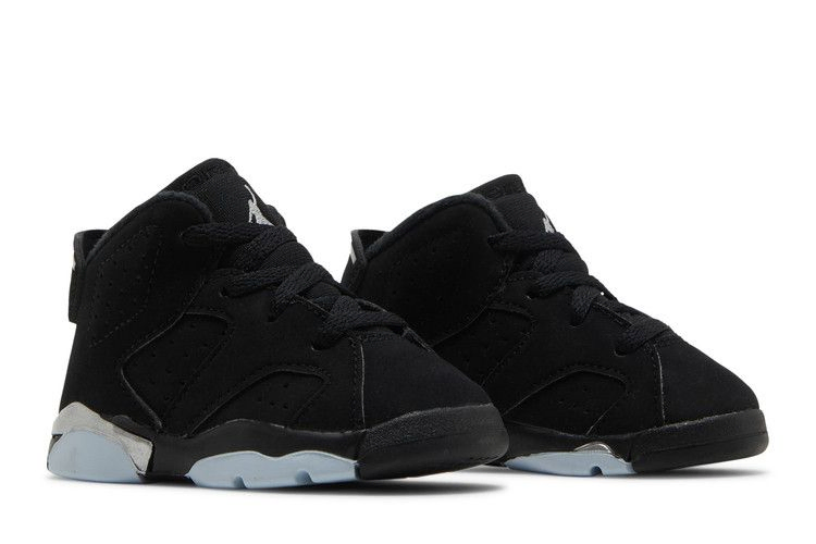 The Air Jordan 6 Retro TD 'Chrome' is a condensed version of the silhouette worn by Michael Jordan when he won his first NBA title. Just like the championship colorway, this pair features a layered black synthetic nubuck upper. Contrasting silver metallic accents adorn the Jumpman tongue, molded heel tab and soft foam midsole. Non-marking rubber outsole provides reliable grip for growing feet.