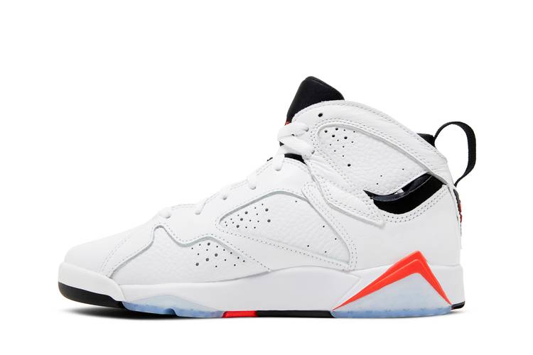 Smaller for big kids, the Air Jordan 7 Retro GS "White Infrared" features a distinctive palette that takes its cues from the OG colorway of the Air Jordan 6. The upper features a perforated White leather upper with neoprene black inner boot. A Jumpman badge adorns the side collar with infrared embroidery. The vibrant hue is repeated on the polyurethane midsole, which features Air cushioning and is backed by a translucent rubber outsole.