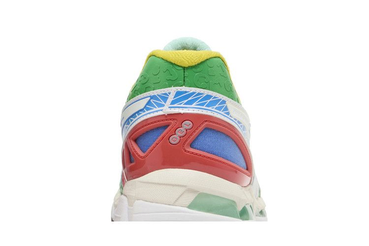 The KENZO x ASICS GEL Kayano 20 "Multicolor" is based on a three-piece footwear collection created in collaboration with NIGO. The upper combines breathable green mesh with multi-color detailing on the side panels that feature a variety of 3D printed animal patterns. Subtle blue lines line the white leather lateral stripes while "KENZO" branding appears on the lateral forefoot. Mismatched ASICS and KENZO tags adorn the tongue. The sneakers rest on a lightweight foam midsole with visible GEL cushioning in the forefoot and heel.