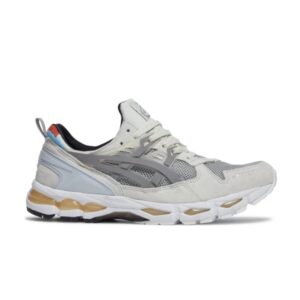 The Awake NY x ASICS Gel Kayano 21 "Cool Grey" sneakers feature a neutral color scheme inspired by the New York brand. The premium construction combines breathable gray mesh with reflective silver tiger stripes and white suede overlays that feature the Awake logo embossed on the lateral forefoot. It sits atop a sculpted FluidRide midsole, complemented by noticeable ASICS Gel cushioning in the forefoot and heel.