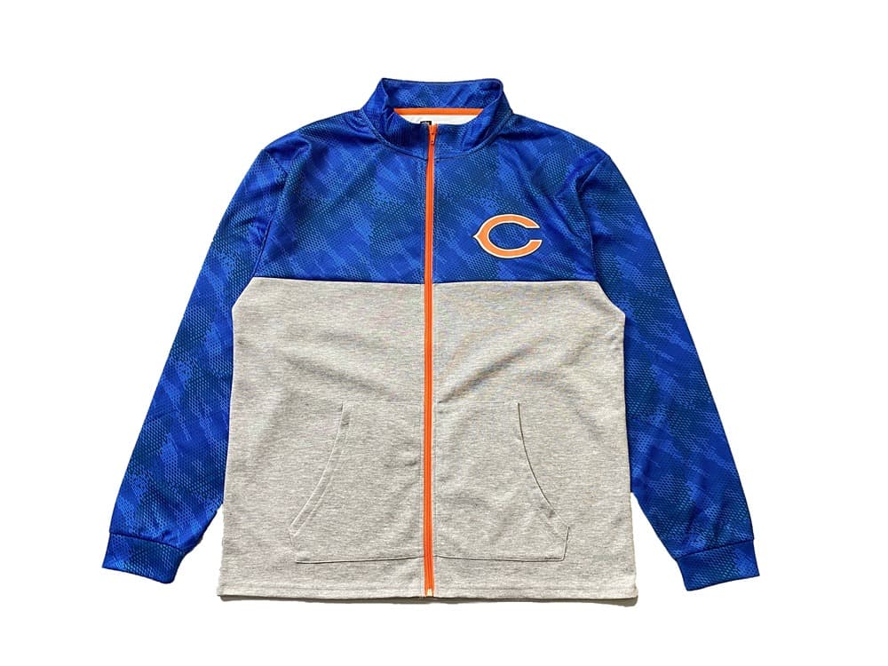 Jacket B20THER NFL Bears Blue The Light Blue Jacket has a loose fit with a gray hem and orange accents. The front features a print in the NFL Bears team colors, a zip fastening and a stand-up collar. This comfortable jacket is perfect for training, as it does not restrict movement and is made of quick-drying polyester.