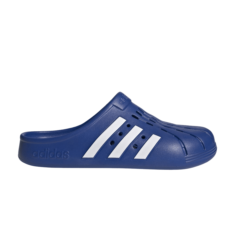 The adidas Adilette Clog "Royal Blue" is a closed-back sneaker inspired by the iconic adidas slide. The one-piece EVA foam upper is molded in a royal blue color and features contrasting white stripes and vents throughout the toe box. The adidas logo is embossed on the contoured insole, while the raised heel cup supports the rear of the foot. The sole has a classic herringbone tread for reliable grip on various surfaces.