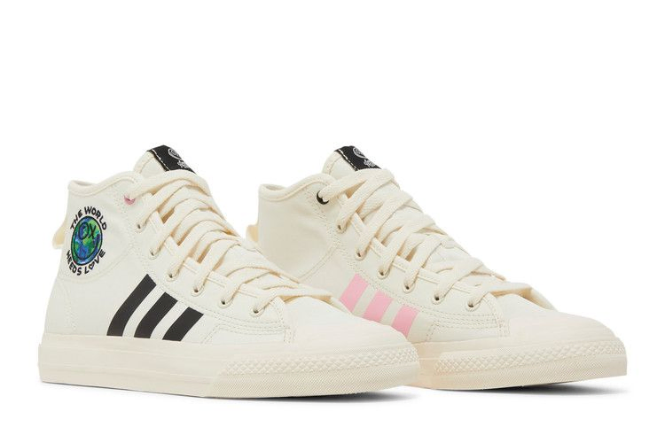 The André Saraiva x adidas Nizza Hi RF J "The World Needs Love", available in kids' sizes, is an eco-friendly take on the graffiti artist's vintage sneaker. A neutral creamy white finish sits atop a breathable textile upper made from 50% recycled materials and is accented with mismatched black and pink stripes. Embroidered graphics on the right boot depict a smiling globe with the phrase "The World Needs Love." The left shoe depicts two characters from the artist Mr. A, which hold the Earth in a loving embrace.