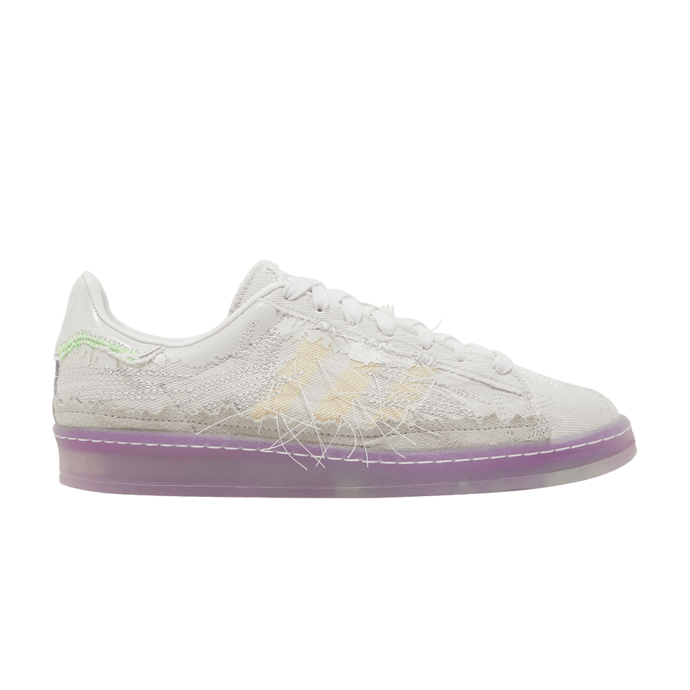 The Youth of Paris x adidas Campus 80s 'White' features a classic silhouette with a DIY twist. The Parisian label dressed the top in white distressed denim, accentuated by random stitching with overhanging threads. Neon green zigzag stitching contrasts the side heel counter and heel counter. Ripped edge suede detailing is layered across the base of the upper, highlighting the deconstructivist aesthetic. Under the sole made of translucent purple rubber, you can see the Youth of Paris logo in an enlarged size.