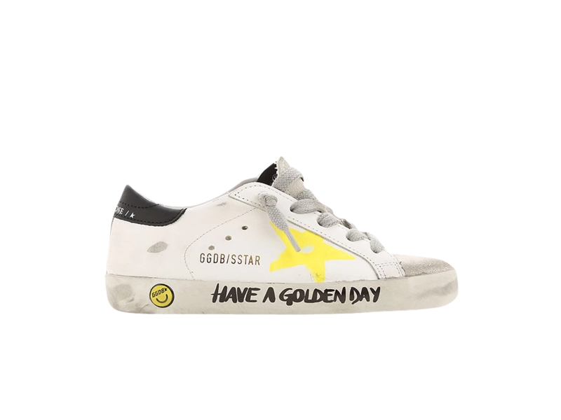 Golden Goose Superstar Kids White Yellow sneakers have a round toe, Golden Goose logo on the side, a dirty and scuffed effect. A rubber outsole completes the design. Made in Italy.