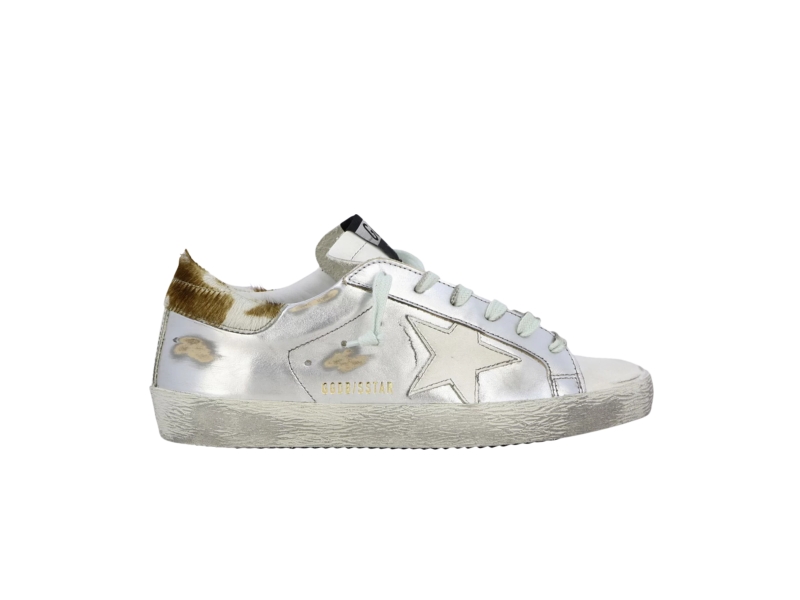 Golden Goose Wmns Superstar Silver Pony sneakers have a round toe, Golden Goose logo on the side, a dirty and scuffed effect. A rubber outsole completes the design. Made in Italy.