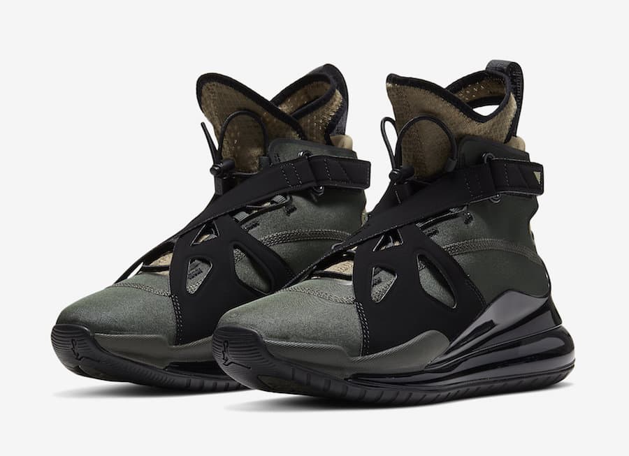 The Wmns Jordan Air Latitude 720 continues the Flight Utility series with a provocative design inspired by an avant-garde aesthetic. Introduced in July 2019, this women's colorway features a textile upper with deconstructed AJ 8-inspired straps and a glossy mudguard. Reversible lacing adjusts the fit of the inner mesh boot. The sneakers sit atop an enlarged air chamber and tubular rubber outsole.