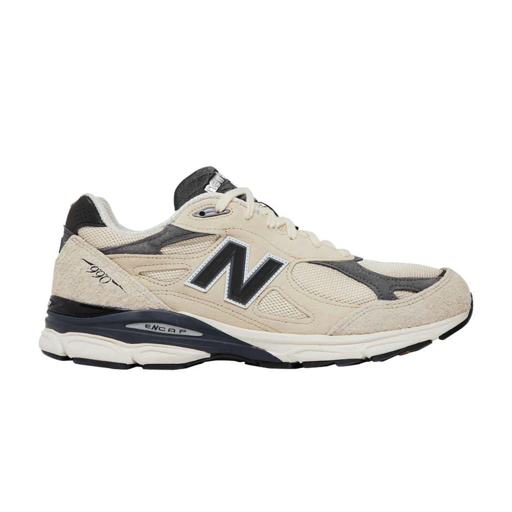 The Teddy Santis x New Balance 990v3 Made in USA "Moonbeam" combines sophisticated materials and a restrained palette. A neutral cream colored mesh and suede upper is contrasted by gray suede overlays on the toe box and collar. "New Balance USA" branding appears on the charcoal tongue, while a black "N" logo adorns the heel. The model rests on a two-tone ENCAP midsole with soft foam and a durable polyurethane rim.
