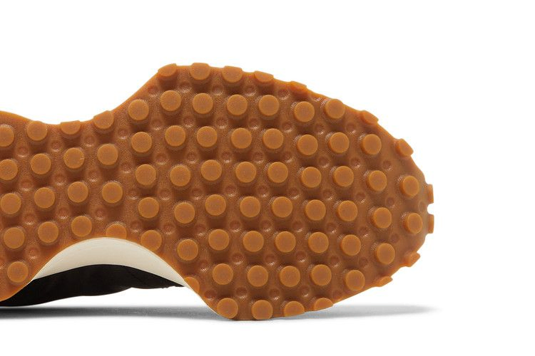 The New Balance 327 Women's 'Black White Gum' features an oversized White pebbled leather 'N' logo on the lateral side of the upper, constructed from Black nylon with tonal suede overlays on the toe and heel. An EVA midsole with raised sidewalls in white provides lightweight cushioning. Rubber outsole with overlays on the toe and heel provides easy traction.