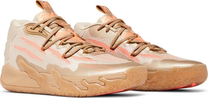 The PUMA MB.03 Chinese New Year colorway updates LaMelo Ball's third signature shoe with a festive design in honor of the Year of the Dragon. The mid-top features a tan mesh upper and features coral claw marks throughout the upper and side panels. Dull Gold accents are placed on the forefoot overlay and tongue, which is adorned with LaMelo's wings logo. Gold glitter adorns the rubber outsole that wraps around the sidewalls of the khaki NITROFOAM midsole.