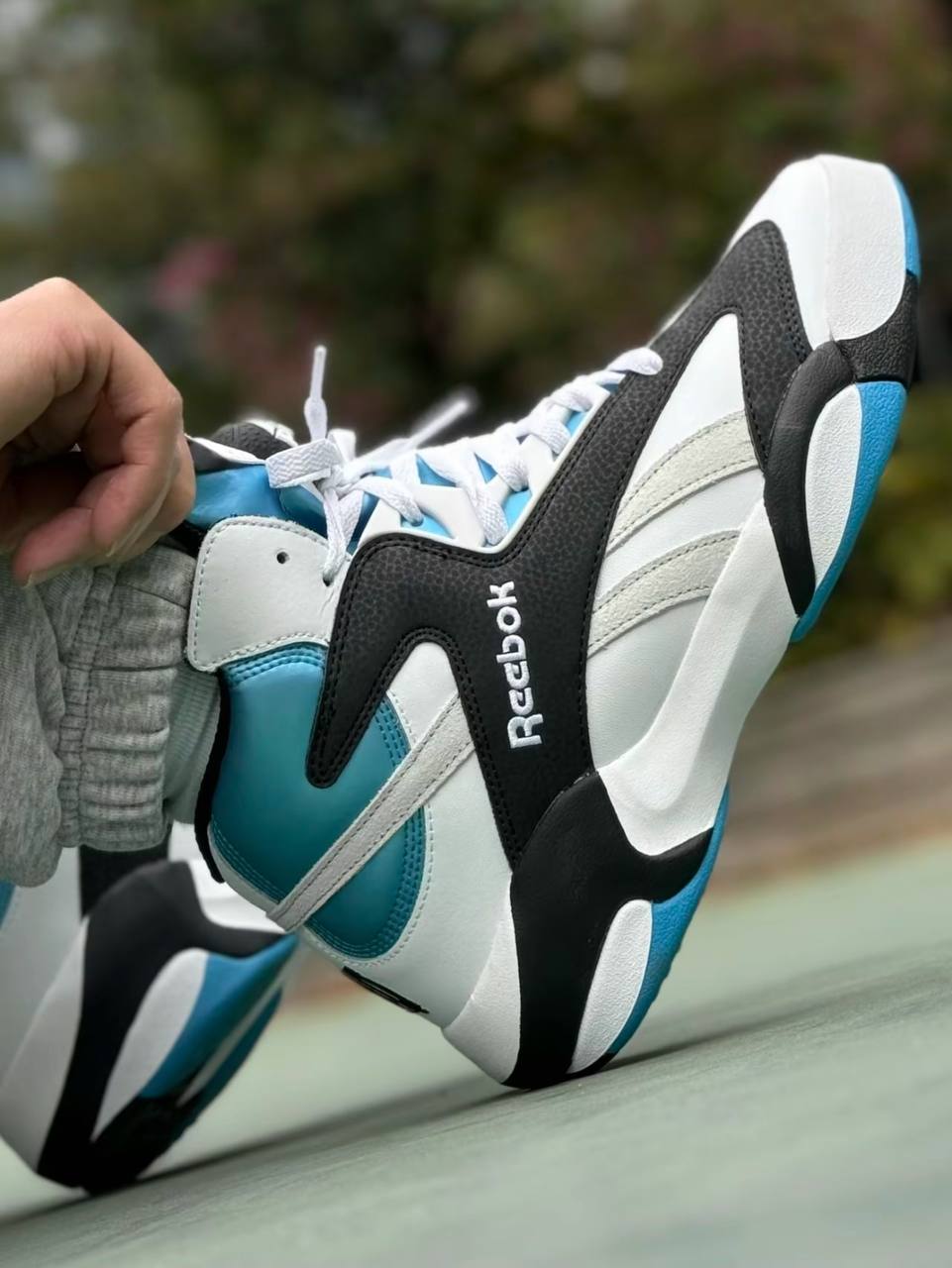 Celebrating the silhouette's 30th anniversary, the 2023 Reebok Shaq Attaq "Orlando Magic" reissue revives Shaquille O'Neal's first signature sneaker. True to the original 1992 release, the shoe features a White leather upper with textured Black nubuck overlays. Metallic cerulean blue accents adorn the padded collar and tongue with a rubber Pump button that activates the shoe's custom fit. Shaq's "Dunkman" logo adorns the rear heel, while the Reebok branding is embroidered on the lateral side. The shoe sits atop a soft EVA midsole supported by an exposed Graphlite plate and durable rubber at the toe and heel.
