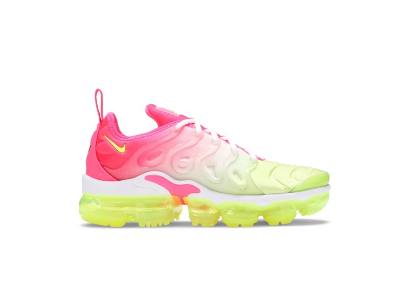 The Air Max Plus legacy began in 1998 with the original sneaker designed by Sean McDowell, and in 2018 the Wmns Air VaporMax Plus "Sherbet" continued the story with modern shock absorption technology. This women's shoe features a gradient textile construction with contrasting black accents. Constructed from neoprene and TPU, the upper sits atop a cushioned VaporMax Air outsole, an innovative design element of the silhouette.