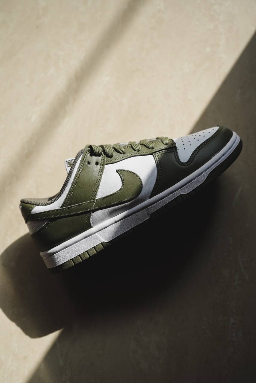 The Nike Women's Dunk Low "Medium Olive" features a traditional two-tone colorway reminiscent of the original 1985 "Be True to Your School" run. The leather upper combines a clean White base with Olive Green overlays and color-coordinated Swoosh. The shoe features a traditional rubber outsole with white sidewalls that contain a lightweight foam wedge for a cushioned ride. Underfoot is an olive rubber outsole with a traction pattern designed for parquet.