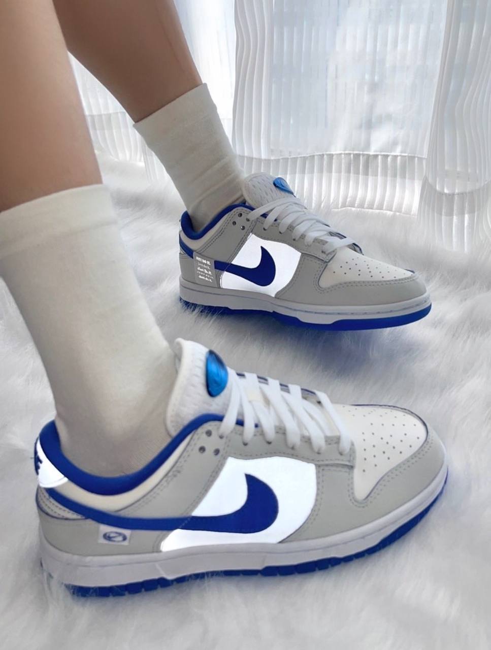 The Wmns Nike Dunk Low Worldwide Pack White Game Royal Women's Sneaker brings a stylish twist to a vintage silhouette. Nike's signature White hue adorns the leather upper, as well as faux quilted detailing on the collar, quarter and toe box. An embossed Nike logo appears on the heel, while a woven Nike label adorns the nylon tongue. The sneakers are supported by a traditional cupsole, highlighted by white sidewalls and a rubber outsole.