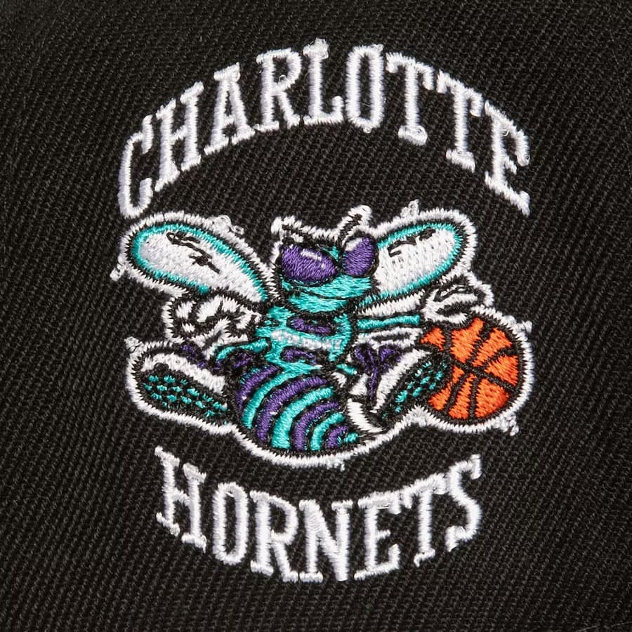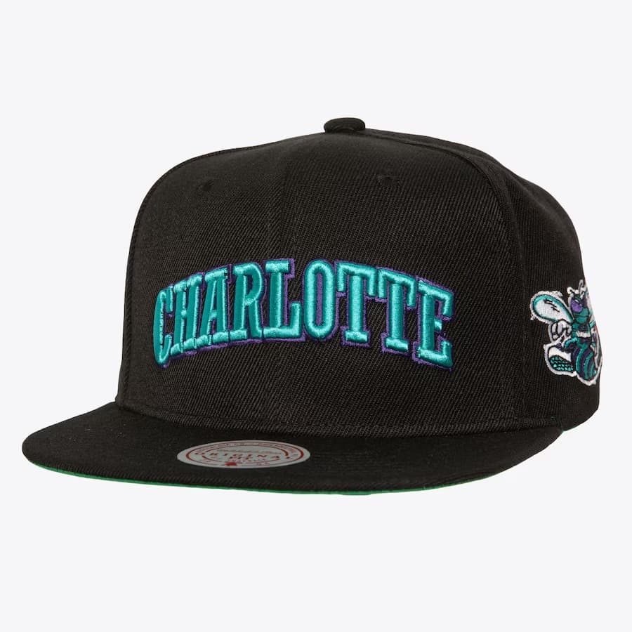 Black Baseball Cap with Turquoise Accents Mitchell & Ness Black Charlotte Hornets Hardwood Classics Triple Play Snapback Hathas a retro style with a snap closure at the back for adjustment, Embroidered Hornets logo, Mitchell & Ness branding on the back and a straight visor for maximum style. The baseball cap is made of 100% polyester with a green lower part of the visor.