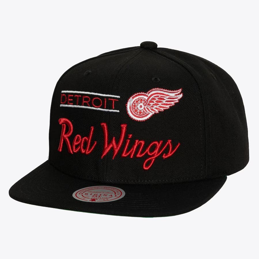 NHL time has come! Black baseball cap with red accents Mitchell & Ness Black Detroit Red Wings Retro Lock Up Snapback Hatv The retro style features a snap closure at the back for adjustment, an embroidered Red Wings logo, Mitchell & Ness branding on the back and a straight visor for maximum style. The baseball cap is made of 100% polyester with a green lower part of the visor.