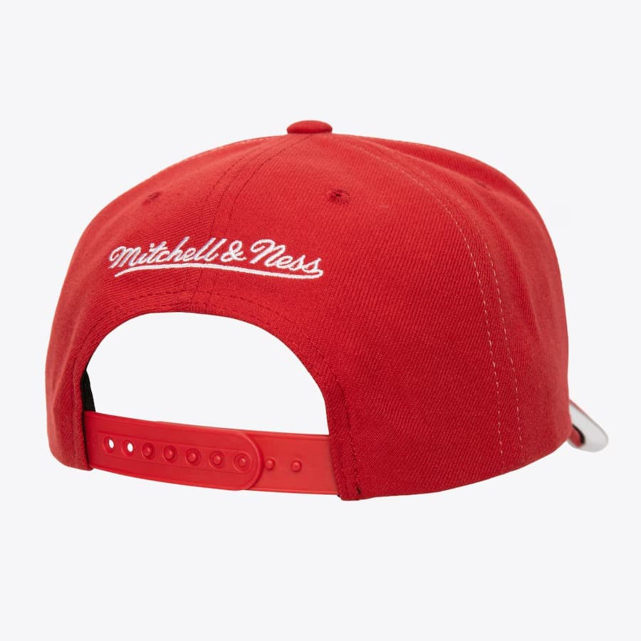 White baseball cap with red accents Mitchell & Ness White Chicago Bulls Core VII Snapback Hathas a retro style with a snap closure at the back for adjustment, an embroidered Bulls and Mitchell & Ness logo on the back and a straight visor for maximum style. The baseball cap is made of 100% polyester with a red lower part of the visor.