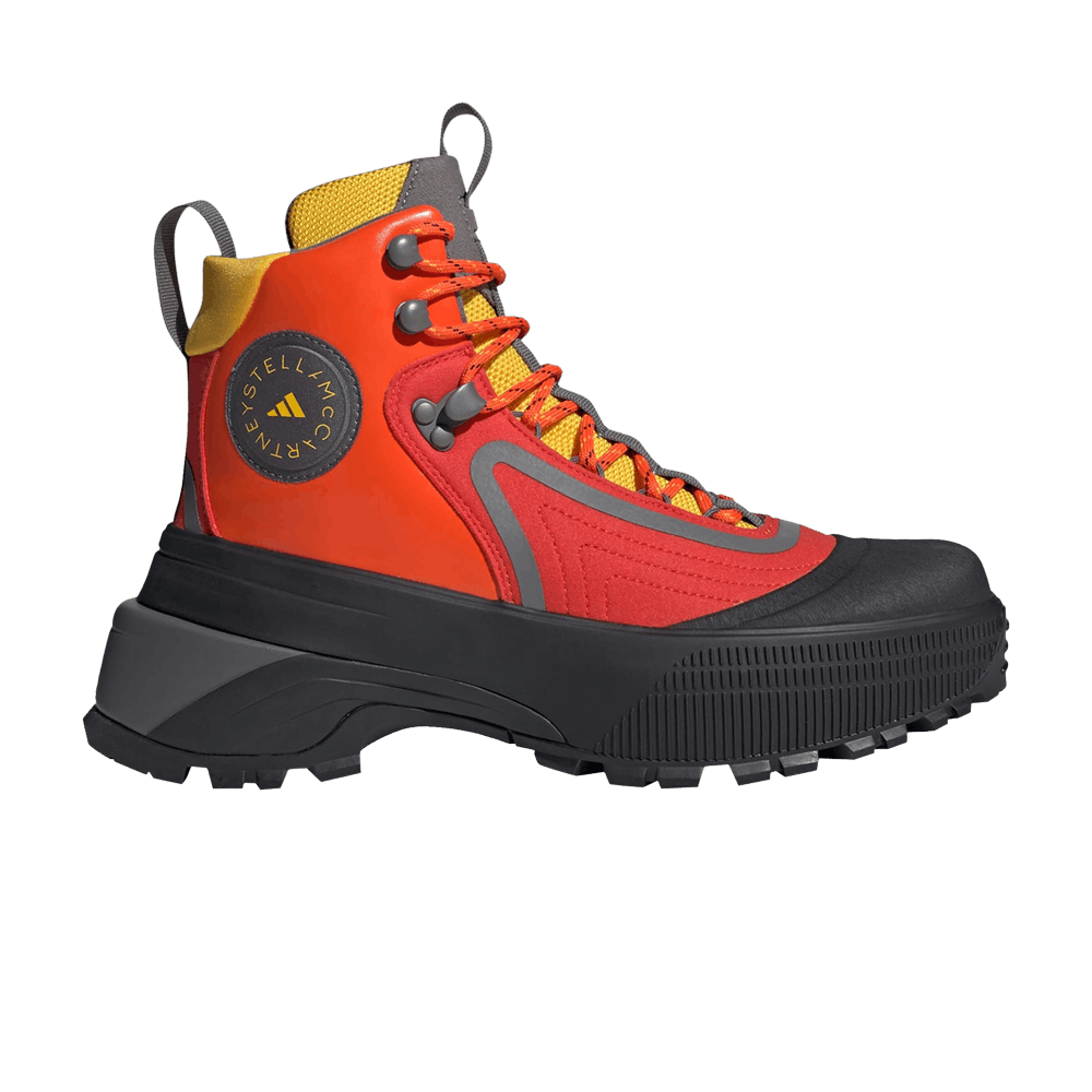 The Stella McCartney x adidas Women's Terrex Hiking Boot 'Active Red Crew Yellow' showcases vibrant hues in a rugged silhouette built for outdoor adventures. Synthetic upper in vibrant red and orange tones with lining, high collar and reinforced toe cap. Speed laces and pull tabs at the tongue and heel make it easy to get on and off. The boots sit atop a lightweight EVA midsole made from 10% recycled content, backed by a knurled rubber outsole.