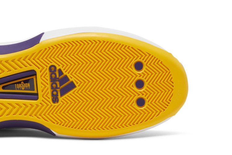 The 2023 adidas Crazy 1 "Lakers Home" reissue features Kobe Bryant's former signature sneaker in a Los Angeles-inspired colorway that released in 2006. The molded synthetic upper is made from partially recycled materials and features Three-Stripes embossed on the rear panel. adidas branding is embroidered in Collegiate Purple on the padded tongue, which matches the yellow mesh mid-cut collar for a comfortable fit. An updated lightweight EVA midsole is supported by the adidas Torsion system and a herringbone rubber outsole.
