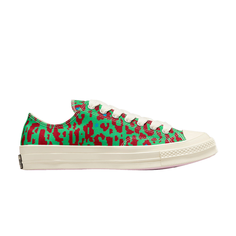 Created from the four-piece "Digital Leopard Pack," the Golf Le Fleur x Converse Chuck 70 Low "Green" is a fashion-forward take on a sneaker icon. The low-profile model uses a traditional canvas upper, adorned with Tyler, the Creator leopard print in green and red. Heritage details include a reinforced rubber toe cap and winged stitching on the tongue. Underfoot, the rubber outsole features a graphic featuring Tyler's silhouette in his bellhop suit.
