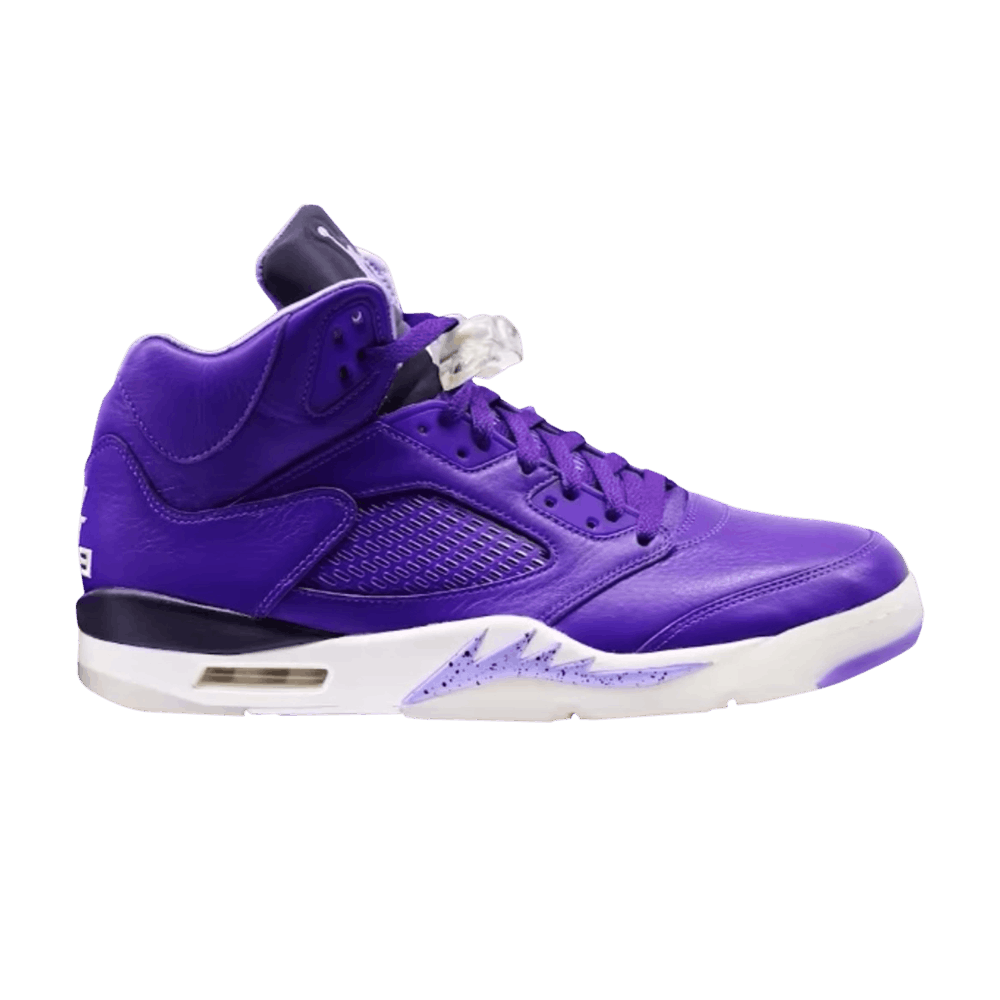 DJ Khaled x Air Jordan 5 Retro 'Court Purple' is a friends and family exclusive colorway taken from the "We the Best" capsule collection. The silhouette is crafted from purple leather with tonal quilted textile on the interior lining. "We the Best" is embroidered in cream on the left heel, a Nike Air logo appears on the right heel, and a lavender Jumpman adorns the reflective tongue. Lightweight cushioning is provided by a white PU midsole with lilac shark teeth detailing. Khaled's "We the Best" message is repeated on the translucent rubber outsole.