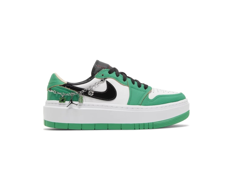 The Wmns Women's Air Jordan 1 Elevate Low SE Lucky Green features a timeless silhouette in a simple two-tone design with an extended platform. The upper is crafted from smooth leather and features a White base with Green overlays. A hidden Wings logo adorns the heel, while an embroidered Jumpman badge graces the tongue. The sneakers are set on a durable rubber sole with a shock-absorbing Air-sole unit in the heel.