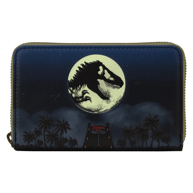 Jurassic Wallet The Park 30th Anniversary Dino Moon Glow Zip Around Wallet is a great purchase for a fan! Welcome to Jurassic Park! Celebrate an unforgettable adventure with the Loungefly wallet. Embark on a journey to a land frozen in time by entering the gate located on the front of the wallet. An ominous silhouette appears on the glow-in-the-dark moon above. Turn your wallet and you'll see a triceratops wandering through a land of lush palm trees. This accessory is ideal for backpackers and will keep your belongings safe when you go on your next expedition.