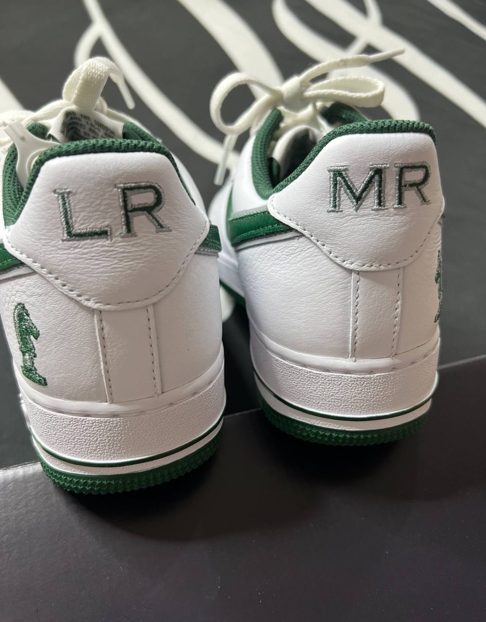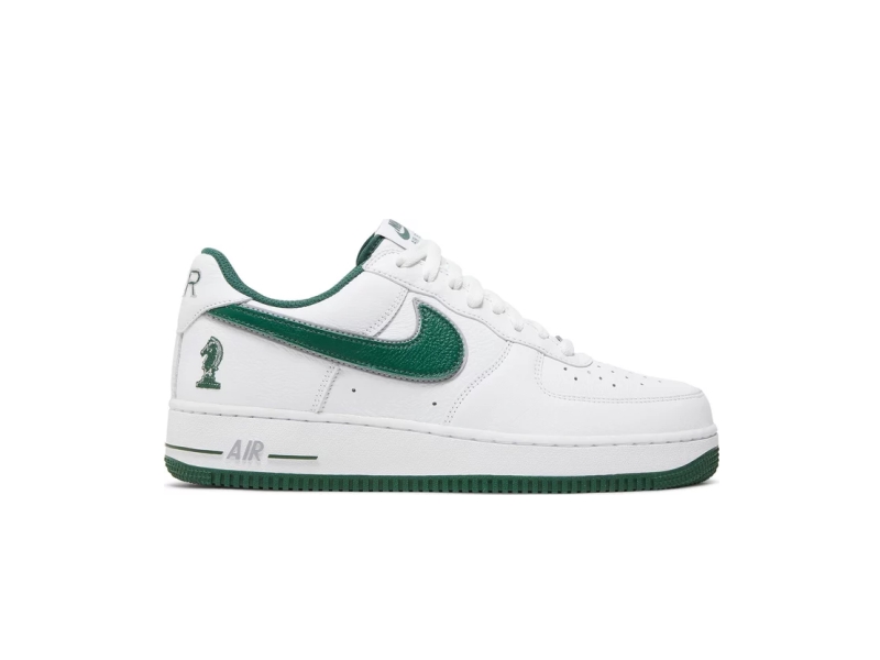 The 2023 LeBron James x Nike Air Force 1 Low "Four Horsemen" features a special colorway inspired by LBJ and his entourage (Rich Paul, Maverick Carter and Randy Mims). The low-top sneaker features White brushed leather and a Deep Forest Swoosh with Wolf Gray detailing. A knight chess piece graphic adorns the heel side, while the rear tongues feature the initials of each of the Four Horsemen. The sneaker is based on a traditional sole with white sidewalls and a green rubber outsole.
