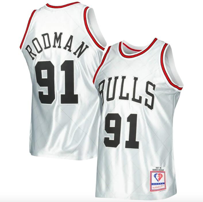 Maillot de basket-ball 1997-98 Chicago Bulls # 91 Dennis Rodman Hardwood Classics 75e anniversaire Maillot Platine 580599 Vêtements de sport et chaussures pour hommes