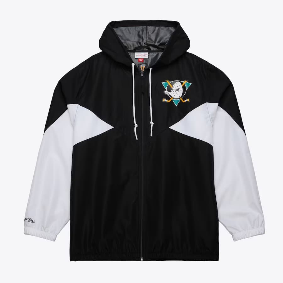 Enjoy the perfect blend of comfort and retro style in this black jacket with white accents Mitchell & Ness Black Anaheim Ducks Vintage Logo Ultimate Lightweight Full-Zip Windbreaker Jacket. It features Ducks team graphics and colors. Convenient pockets and a zip closure make this jacket the perfect wardrobe staple for chilly game days.