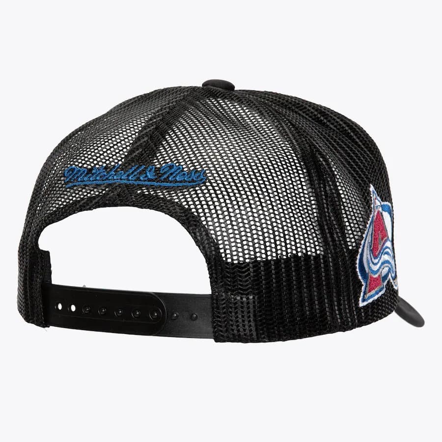 NHL time has come! Black baseball cap with blue and red accents Mitchell & Ness Black Colorado Avalanche Script Trucker Adjustable Hatv The retro style features a snap closure at the back for adjustment, an embroidered Colorado Avalanche, Mitchell & Ness brand logo on the back and a curved visor for maximum style. The baseball cap is made of 100% polyester with a green lower part of the visor.