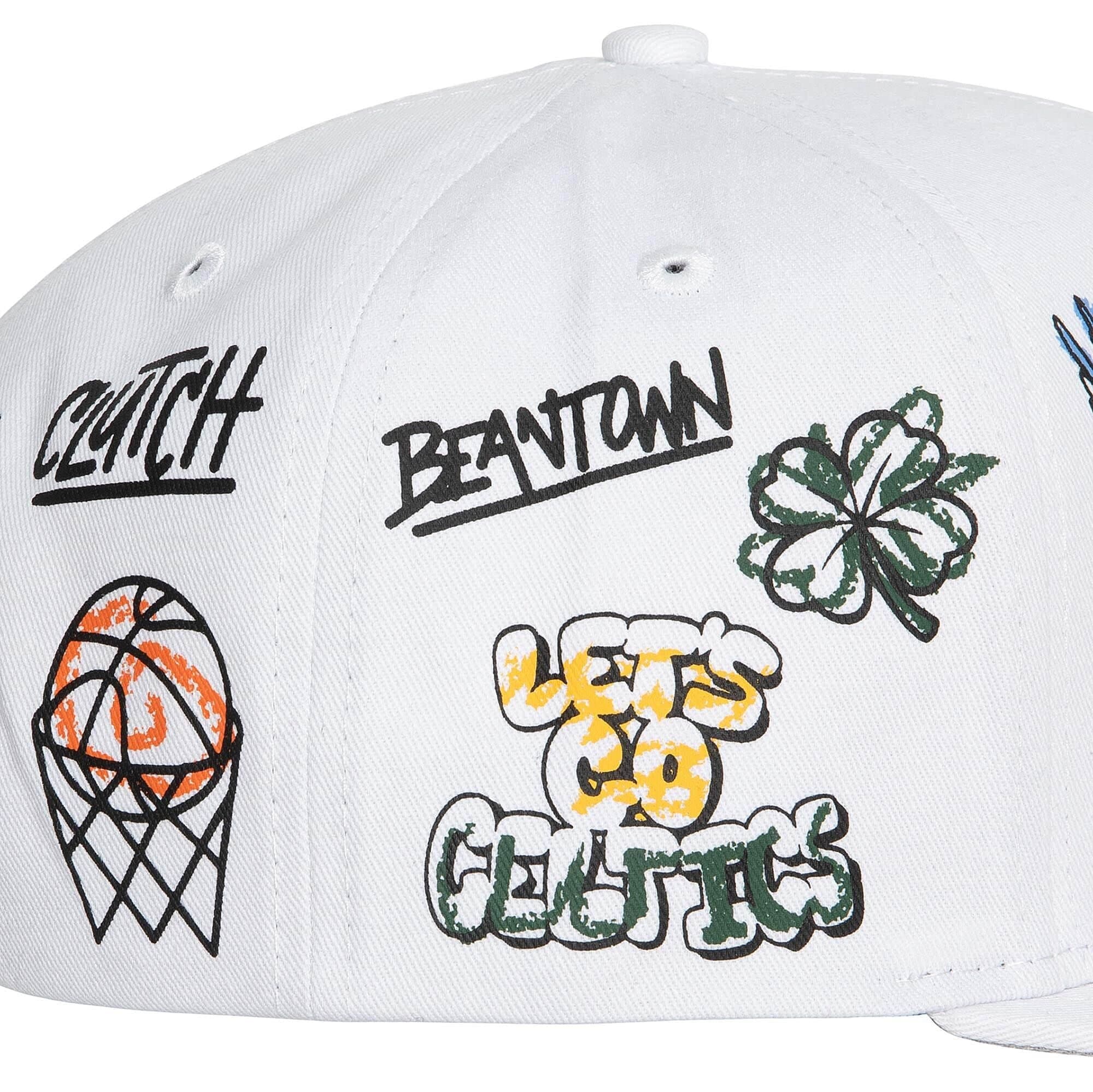 White baseball cap Mitchell & Ness Hand Drawn Snapback Boston Celtics Hathas a retro-style grid for ventilation, a snap closure at the back for adjustment, an embroidered Boston Celtics leprechaun logo, multiple hand-drawn logos, a Mitchell & Ness brand logo at the back and a straight visor for maximum style. The baseball cap is made of 100% cotton.