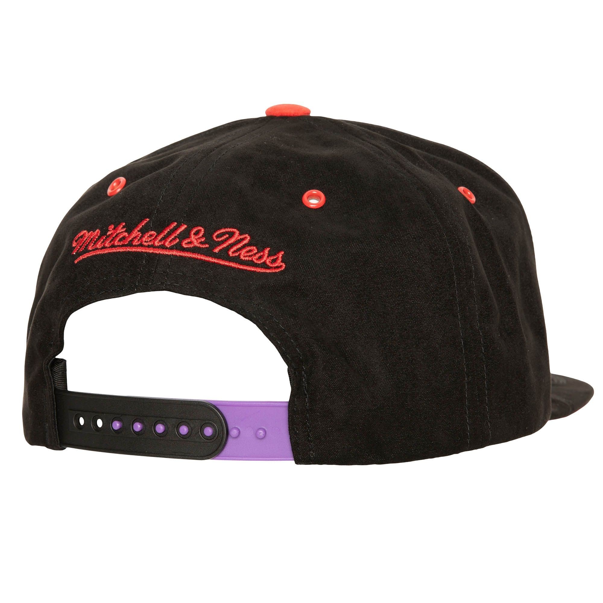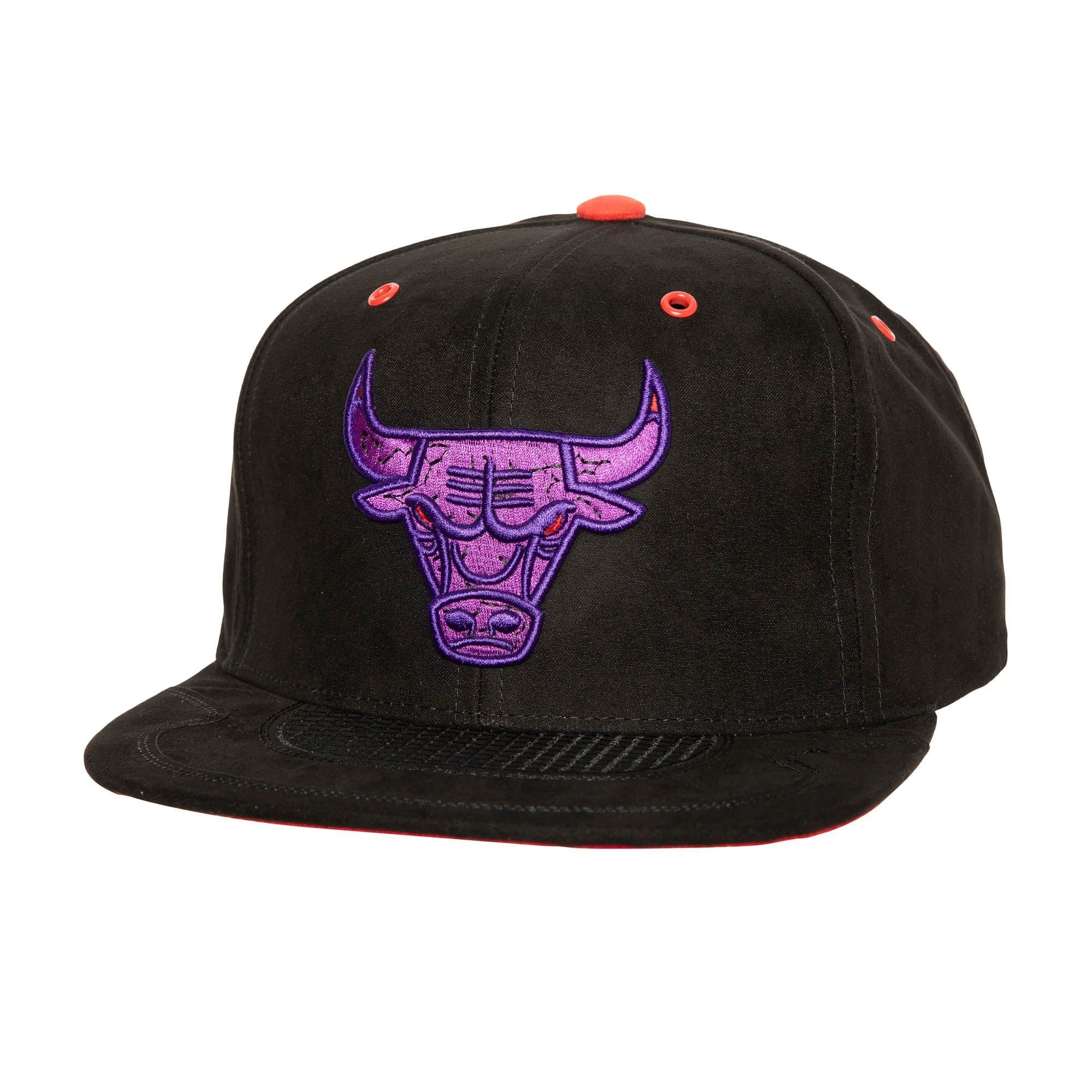 Black baseball cap Mitchell & Ness Day The retro-inspired 4 Snapback Chicago Bulls Puple Hat features a snap back closure for adjustment, an embroidered bull logo in purple, Mitchell & Ness branding on the back and a straight peak for maximum style. The baseball cap is made of 100% polyester with a red lower part of the visor.