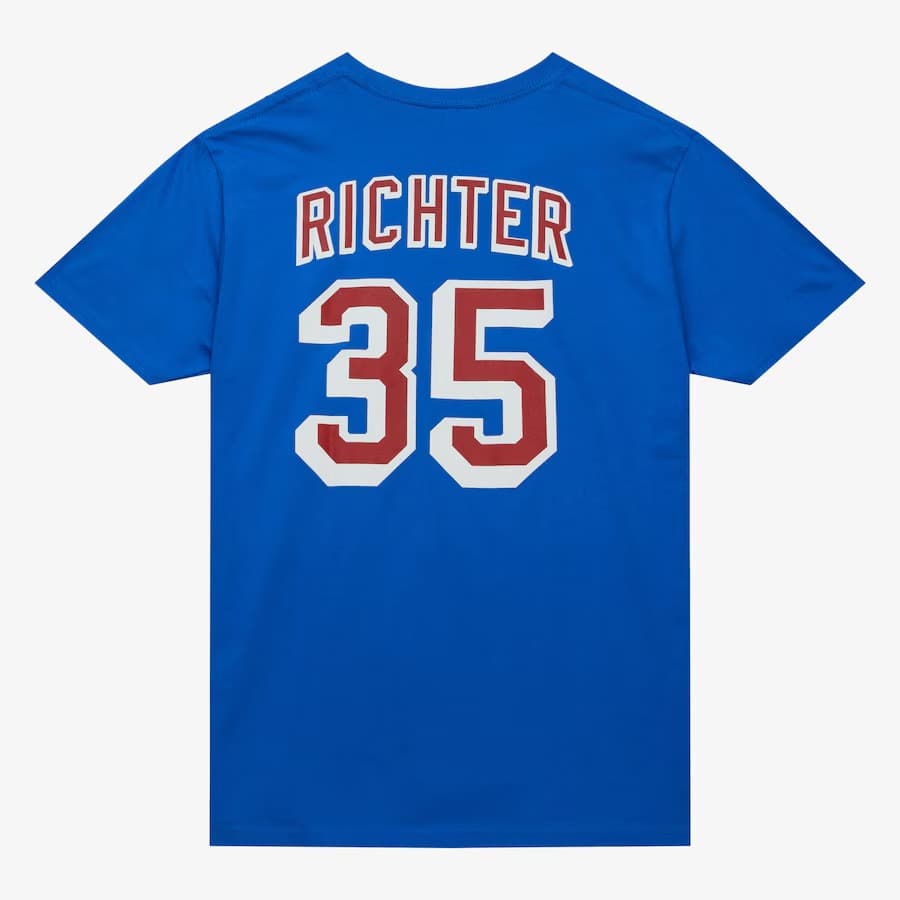 Men's T-Shirt Mitchell & Ness Mike Richter Blue New York Rangers Name & Number T-Shirtmade from high quality cotton in blue with red accents and dedicated to New York Rangers legend Mike Richter. A classic fit T-shirt with the Mitchell & Ness logo will complement your retro style.