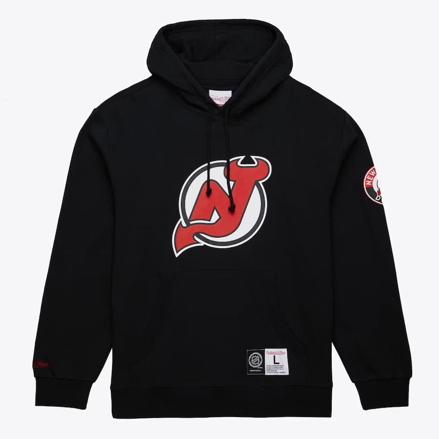 Enjoy the perfect blend of comfort and retro style in this black hoodie with red accents Mitchell & Ness Black New Jersey Devils Game Time Fleece Pullover Hoodie. It features club graphics and Devils team colors. A convenient front pocket and hood make this hoodie the perfect wardrobe staple for chilly game days.