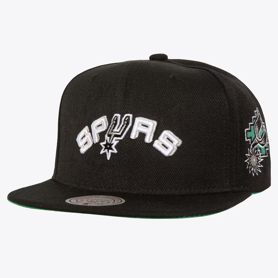 Black Baseball Cap with Turquoise Accents Mitchell & Ness Black San Antonio Spurs Hardwood Classics Triple Play Snapback Hathas a retro style with a snap closure at the back for adjustment, Embroidered Spurs, Mitchell & Ness logo on the back and a straight visor for maximum style. The baseball cap is made of 100% polyester with a green lower part of the visor.