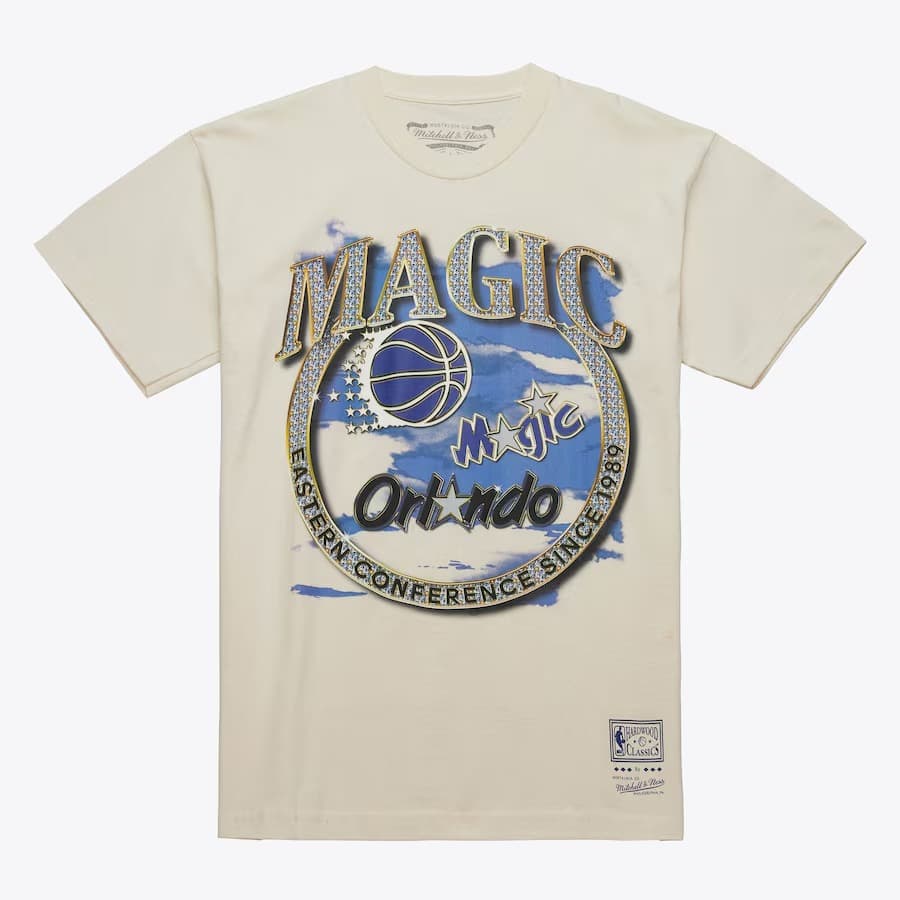 Every city you encounter has something special. The people you meet, the accents you hear, the places you see all add up to the unique DNA of what makes your hometown special. The NBA's latest "Crown Jewels" collection, featuring premium headwear and jerseys, features throwback graphics and designs inspired by some of the most iconic locations on the map. Rooted in sport, perpetuated by culture. T-shirt Mitchell & Ness Natural Orlando Magic Hardwood Classics Crown Jewels T-Shirtmade of high quality cotton in beige with blue accents.